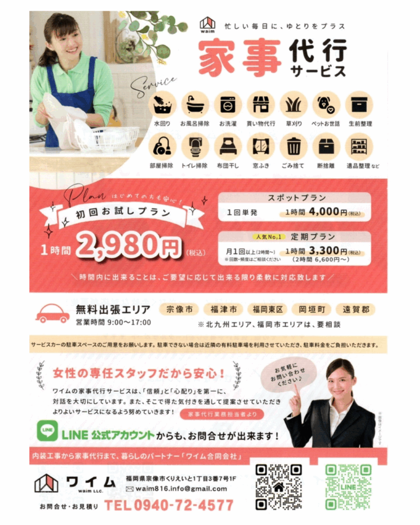 - 家事代行サービス(掃除、洗濯、買い物代行、生前整理、遺品整理 など)
